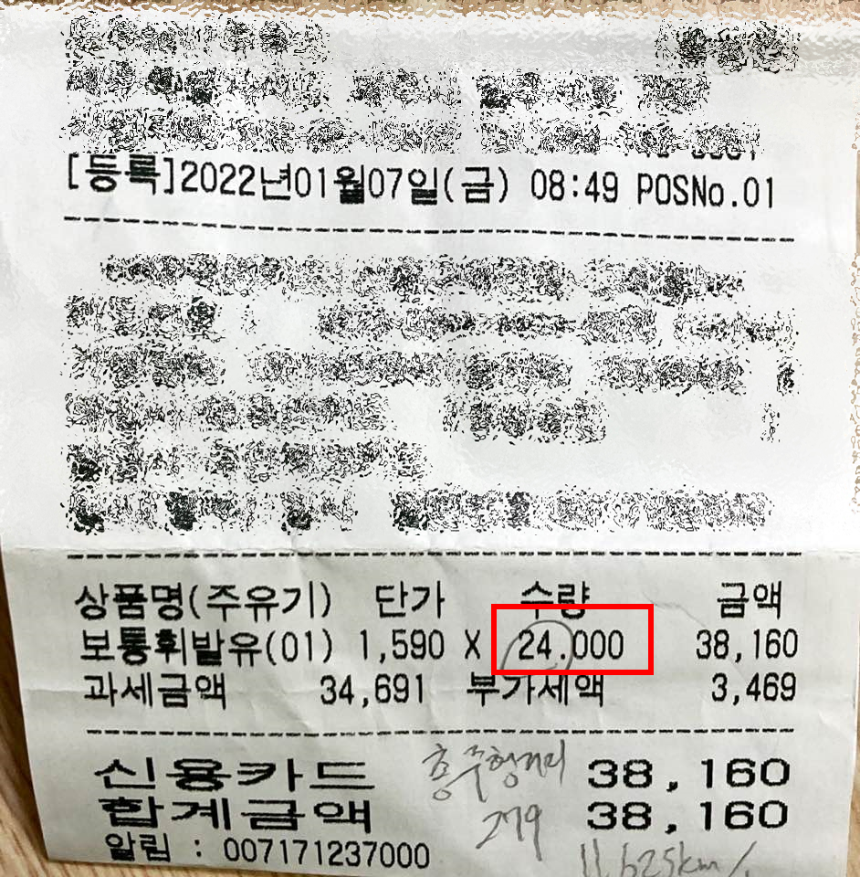주유비 영수증입니다. 휘발유 24L 주유했습니다. 물론 운행할때 연료는 full 상태였습니다.