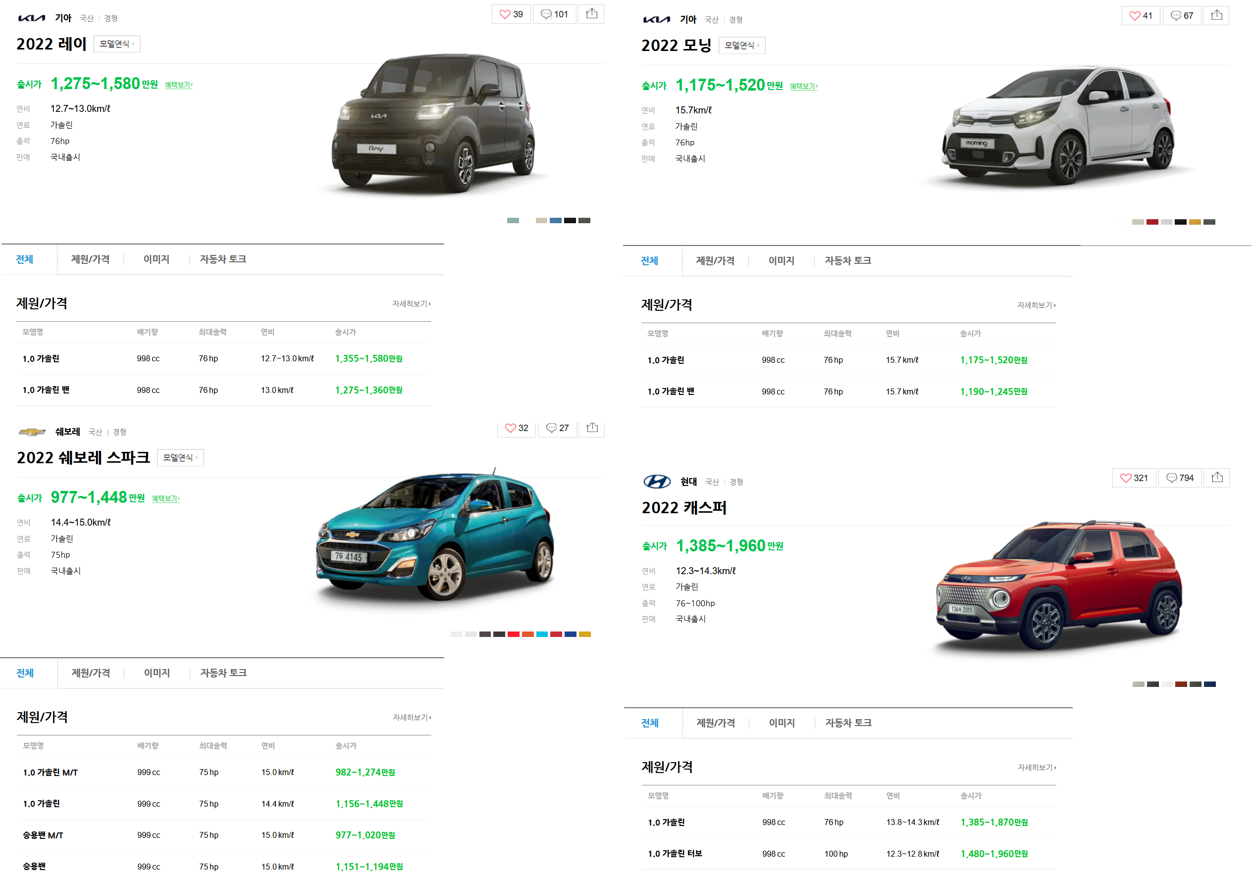 기아 레이 기아 모닝 쉐보레 스파크 현대 캐스퍼