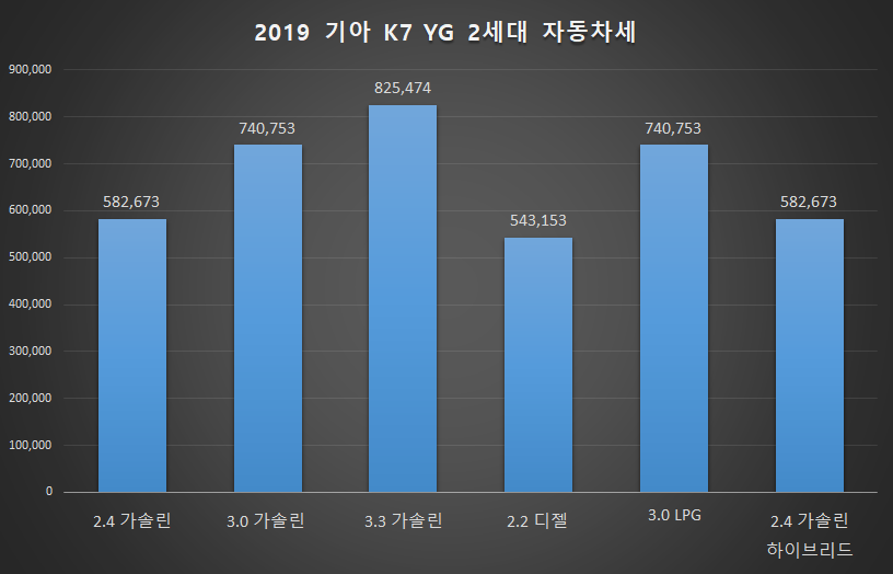 | 2019 기아 K7 | 2.4 가솔린 | 3.0 가솔린 | 3.3 가솔린 | 2.2 디젤 | 3.0 LPG | 2.4 가솔린 하이브리드 |
