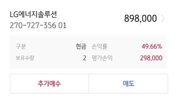 그래도 공모주 청약으로 워낙 싸게 매수했기 때문에 수익률은 50%에 달합니다. 안전마진이 확보된 것이죠. 그리고 배터리사업을 LG에너지솔루션의 미래 수익성 및 가치도 어느정도 확보된 상태라고 생각합니다.