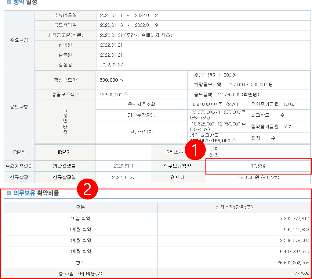 의무보유확약이라는 단어가 생소하실 텐데요. 쉽게 말해서 이 공모주에 청약한 기관들이 특정 기간동안 이 주식을 매도하지 않겠다라는 일종의 약속입니다. 즉, 의무보유확약 수치가 높을 수록 많은 기관들이 이 주식을 특정 기간동안 팔지 않겠다라고 선언을 한 것입니다.