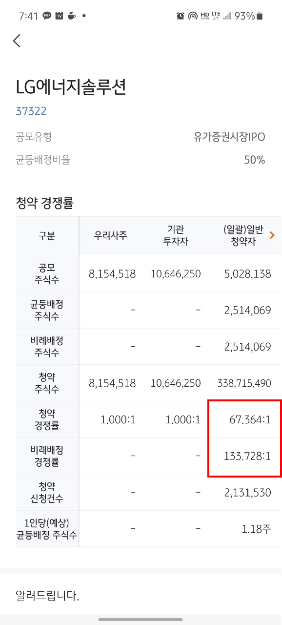 1) KB증권의 일반청약자에 해당되는 공모주가 100만개일때 50만명이 KB증권에 LG에너지솔루션 공모주를 청약한 것과