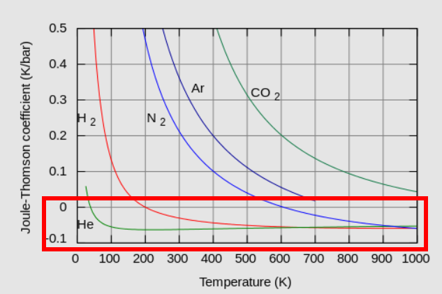 위 그래프는 수소, 헬륨, 질소, 아르곤, 이산화탄소의 줄톰슨 계수 값을 온도에 따라 그래프로 나타낸 것입니다. 강조한 부분을 보시면 줄톰슨 계수가 음수인 걸 볼 수 있습니다.