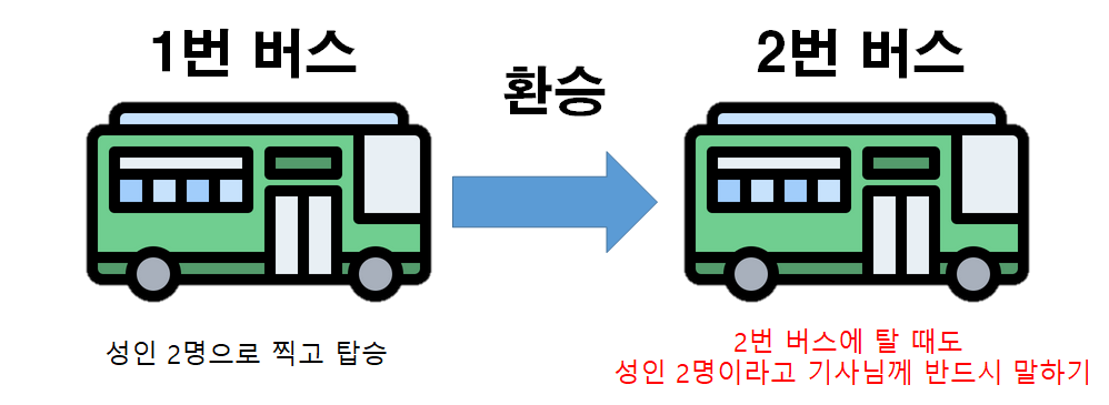 그리고 일반 2명인지 어른 1명, 아이 1명 인지도 꼭 환승하기 전 버스에 탈 때 찍었던 그대로 기사님에게 말씀드려야 환승이 가능합니다.