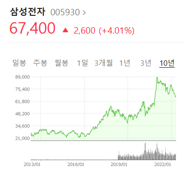 한국의 대표 기업인 삼성전자의 주가 그래프를 보면 2만원 대에서 거의 9만원대를 찍고 현재는 6만원대 후반입니다. 대략적으로만 보아도 주가가 3배로 성장한 것입니다. 간접금융 상품에서는 절대 기대할 수 없는 수익률입니다. 즉, Hig Risk, High Return 입니다.