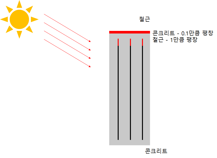 위 그림처럼 햇빛으로 열이 가해지게 되면 철근은 1만큼 늘어나는 데, 콘크리트는 0.1만큼 늘어나게 된다면 철근은 위로 늘어나려는 힘을 콘크리트에 가하게 됩니다. 만약 열팽창계수가 동일해서 철근이 늘어나는 만큼 콘크리트도 팽창한다면 응력이 생기지 않게됩니다.