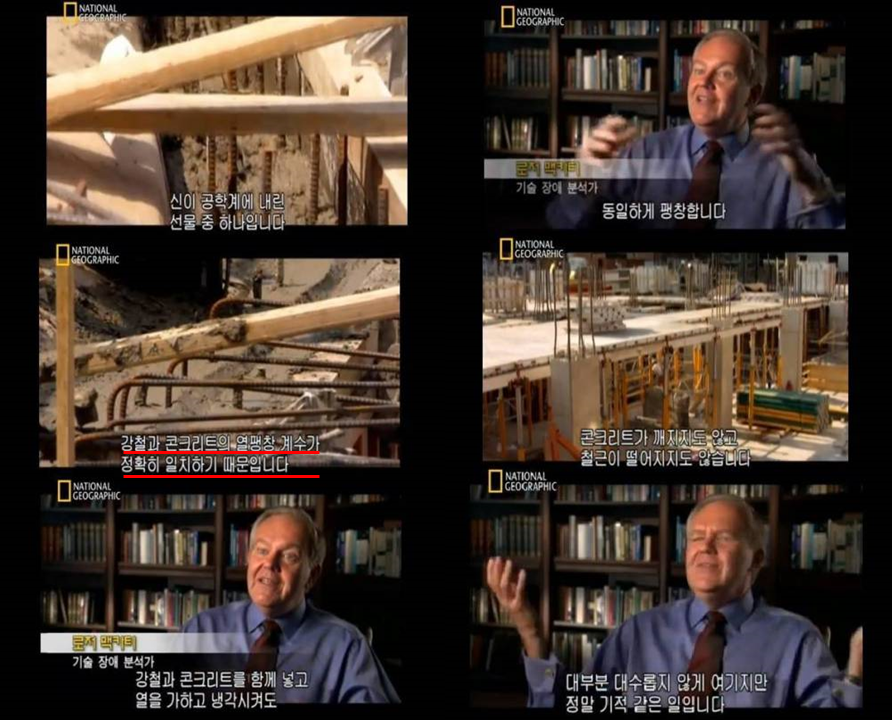 정말 위 다큐멘터리처럼 철근과 콘크리트의 열팽창계수가 동일한 건 엄청난 행운입니다. 그래서 우리가 큰 걱정없이 높은 건물에서 지낼 수 있는 것입니다.