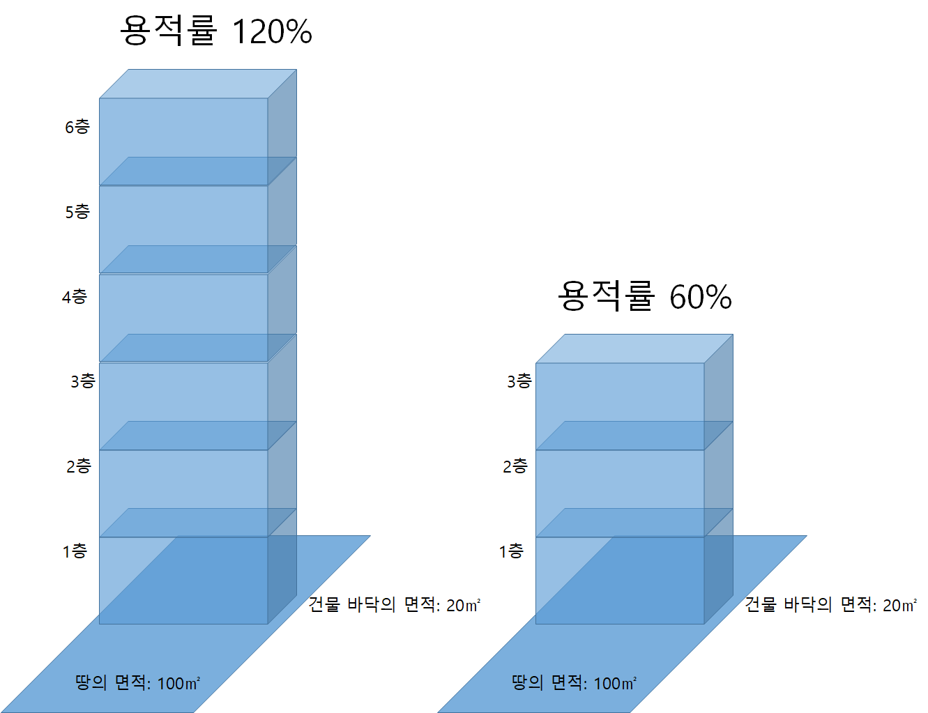 용적률이 높다는 건 땅의 면적이 같을 때 그만큼 건물이 높다는 걸 의미합니다.