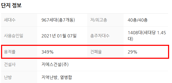 위 표를 보시면 용적률 349%, 건폐율 29%라고 되어있습니다.